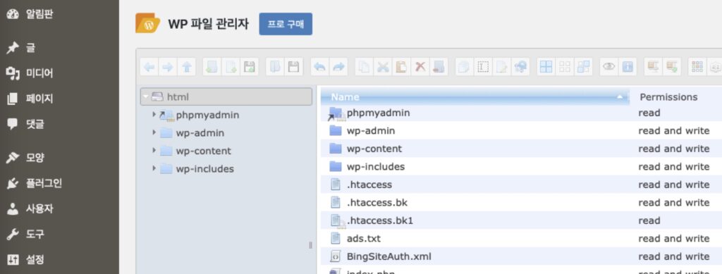 우선 ‘WP 파일 관리자‘ 플러그인을 설치하실 것을 추천드려요. 서버내에 있는 워드프레스 디렉토리 접근 및 파일 수정에 유용하기 때문이에요.