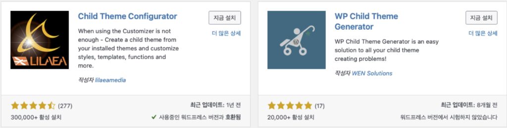 이 방법은 차일드 테마 생성 플러그인으로 차일드 테마를 설치하는 방법인데요.