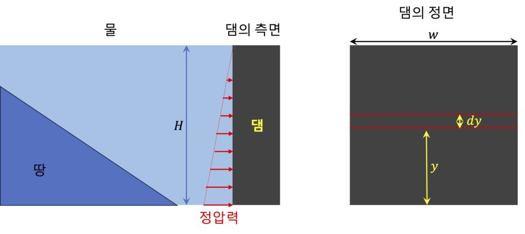 수심이 깊을 수록 정압력의 크기가 커지는 것을 알 수 있어요. 따라서 정압력의 크기가 상수가 아니므로 댐이 받는 정수력을 구하기 위해서는 적분을 해야만 합니다.