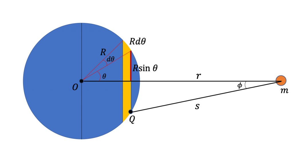 아래 [그림 3]에는 반지름이 R인 큰 균일한 구 껍질이 있고 질량 m인 작은 물체가 그 앞에 놓여져 있습니다.