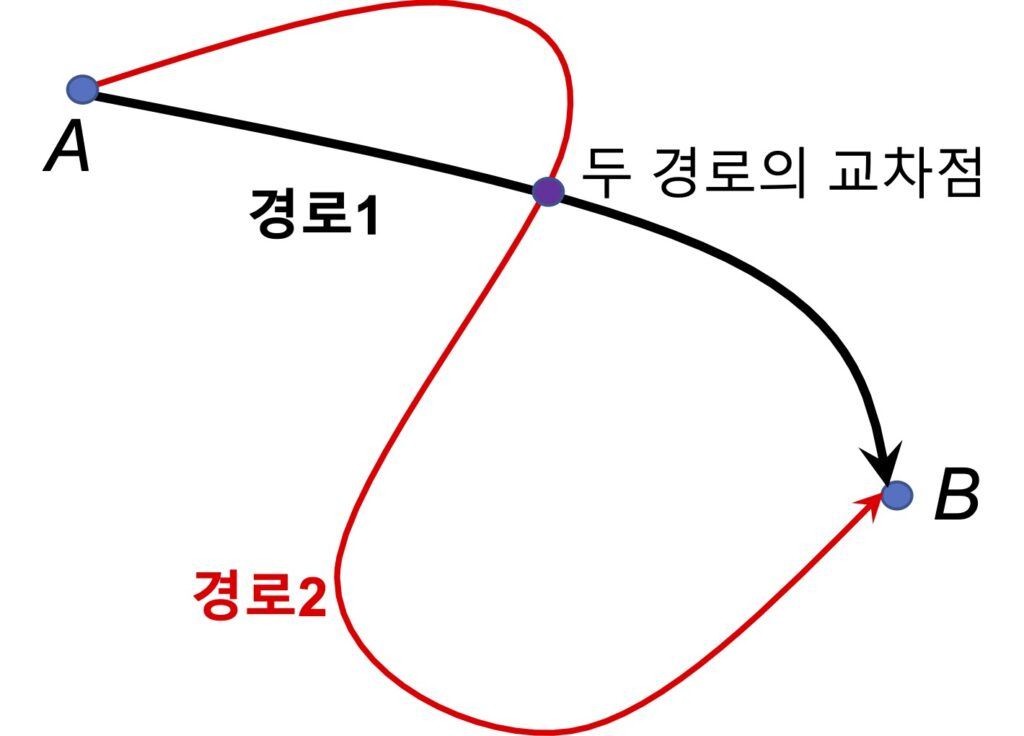 예를 들어 평면위의 A점에서 어떤 물체를 속력 v의 빠르기로 두번 각각 밀쳤더니 한번은 경로1을 따라 이동하였고 다른 한번은 경로2를 따라 이동했다고 상상해보세요.