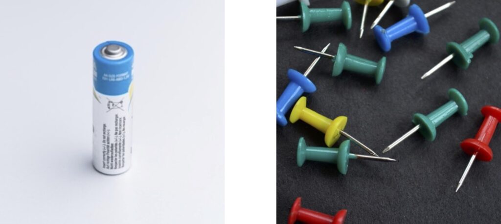 하지만 건전지가 아닌 압정이라면 손으로 눌러 나무판 속에 박는 것이 가능합니다.