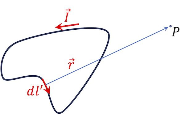 이때 이 도선루프의 미소 길이 요소 d l^{\prime}으로부터 \vec r만큼 떨어진 지점 P를 생각해봐요. 그리고 그 지점에서 도선루프를 따라 흐르는 정상전류 I에 의한 자기장 \vec B(r)을 구한다고 생각해 봐요.