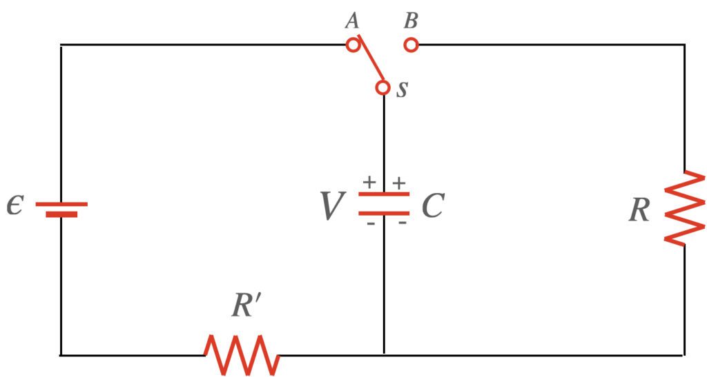 그림 위쪽을 보면 스위치가 있어요. 현재 스위치가 A쪽으로 연결되어 있는데요. 이 상태에서 충분한 시간이 흐르면 축전기가 100% 충전된 정상상태에 도달하게 됩니다.