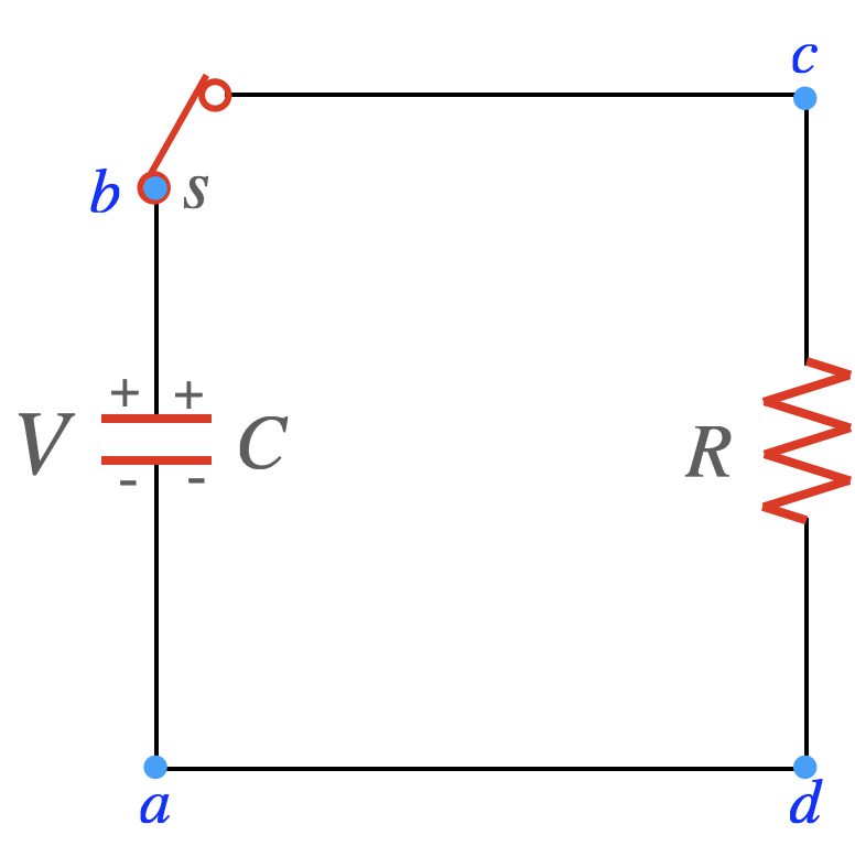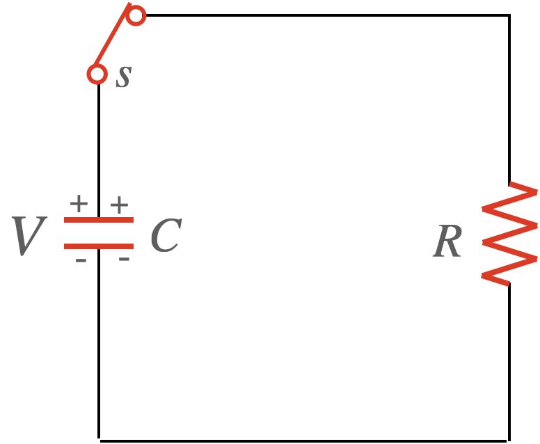 이제 비로소 충전된 축전기 C와 저항 R로 구성된 RC 회로가 만들어졌습니다.
