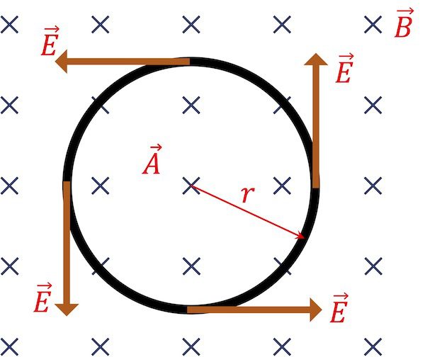 그러면 그림과 같이 자기장과 수직한 방향으로 유도전기장 \(\vec E\)가 생성된다고 보자는 거에요. 즉 기전력 대신에 유도전기장의 관점에서 해석을 하고자 하는 것입니다.