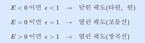 &E<0~이면~~\epsilon<1~~~\rightarrow~~~닫힌~궤도(타원,~~원)\\[8pt]