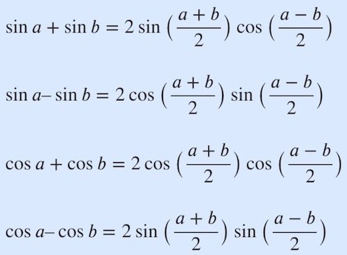 삼각함수 합 또는 차를 곱으로 바꾸는 공식을 유도해 봐요. 삼각함수 합 또는 차를 곱으로 바꾸는 공식입니다. \begin{align*}&\sin a + \sin b = 2 \sin \big({{a+b}\over{2}}\big) \cos\big({{a-b}\over{2}}\big)\\[10pt]&\sin a – \sin b = 2 \cos \big({{a+b}\over{2}}\big) \sin\big({{a-b}\over{2}}\big)\\[10pt]&\cos a + \cos b = 2 \cos \big({{a+b}\over{2}}\big) \cos\big({{a-b}\over{2}}\big)\\[10pt]&\cos a – \cos b = 2 \sin \big({{a+b}\over{2}}\big) \sin\big({{a-b}\over{2}}\big)\\\end{align*} 이 글에서는 … Read more