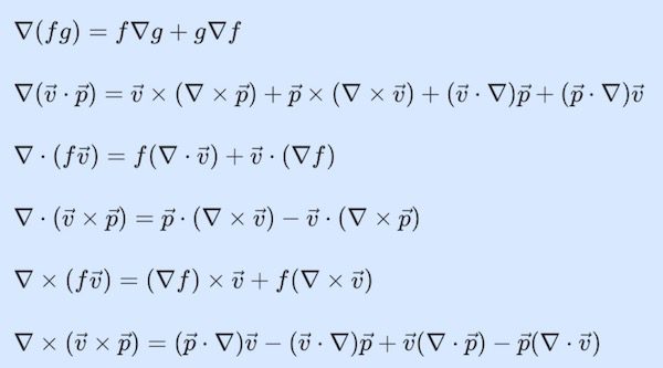 벡터 미분 연산자를 이용한 일계 미분의 몇가지 곱셈 규칙을 알아 봐요. 일계 미분 곱셈 규칙 몇가지를 알아 봐요. 전자기학 등을 공부할 때 자주 등장하는 규칙들이에요. 참고로 몇가지 이계 미분 곱셈 규칙도 있으니 이것이 궁금하면 링크를 클릭하시기 바랍니다. 벡터 미분 연산자(또는 델연산자)가 사용된 일계 미분 곱셈 규칙은 다음과 같아요. 여기서 와 는 스칼라 함수이고 와 는 … Read more